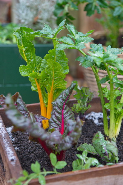 - Feldsalat, Flower Sprout, Gemüse, Grünkohl, Kübel, Mangold 'Bright Lights', Möhren, Postelein, Rosenkohl, Sellerie, Winter, Winterportulak