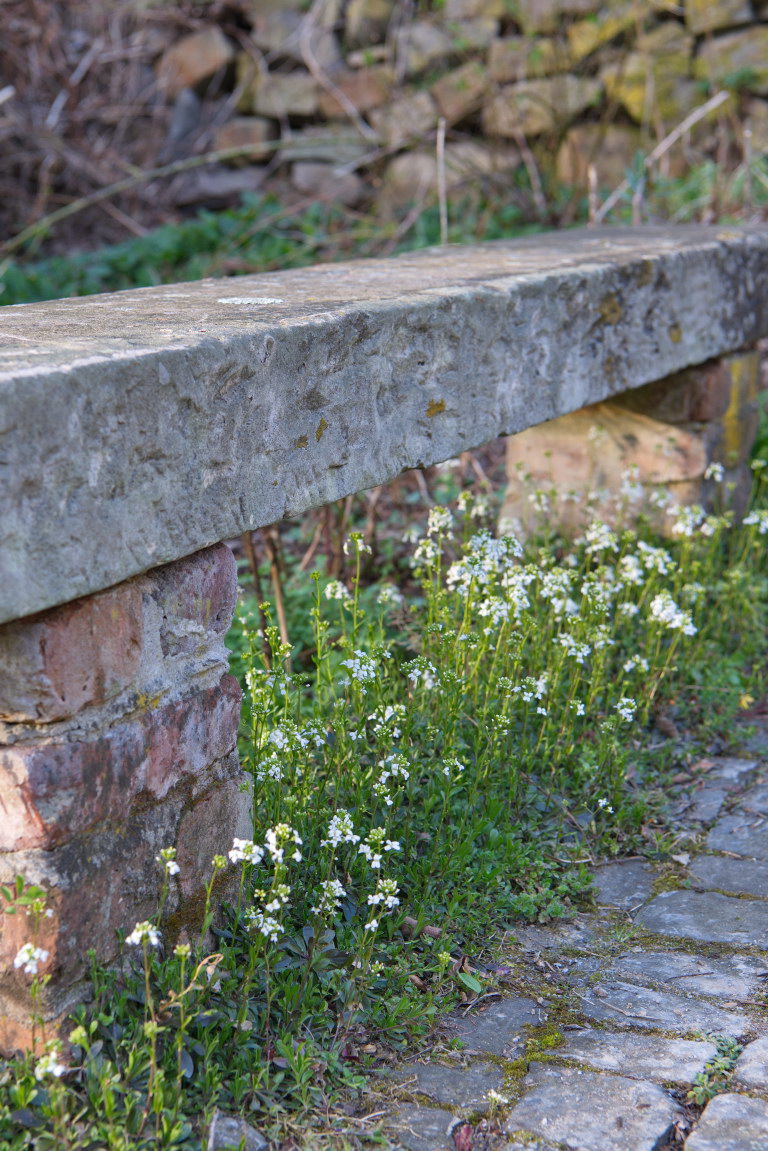 - Arabis procurrens, Bank, Kleine Garten-Gänsekresse, Naturstein, Naturgarten