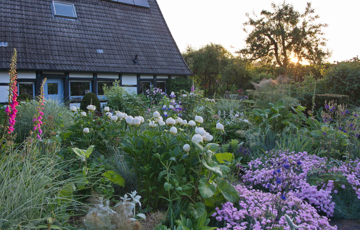 - Dianthus, Digitalis purpurea, Miscanthus 'Morning Light', Paeonia lactiflora 'Jan van Leeuwen'