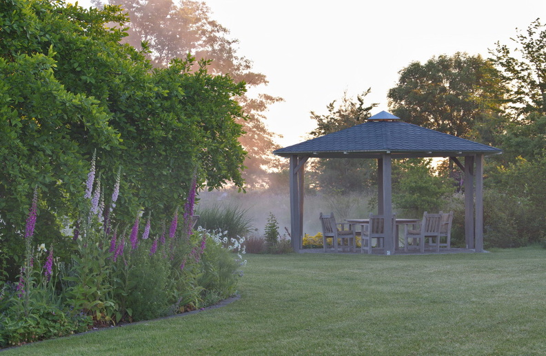 - Bank, Blumenwiese, Delphinium, Digitalis, Leucanthemum, Margerite, Paeonia lactiflora 'Jan van Leeuwen', Rittersporn, Nebel