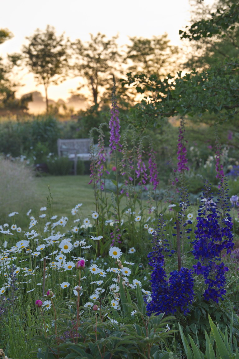 - Bank, Blumenwiese, Delphinium, Digitalis, Leucanthemum, Margerite, Rittersporn