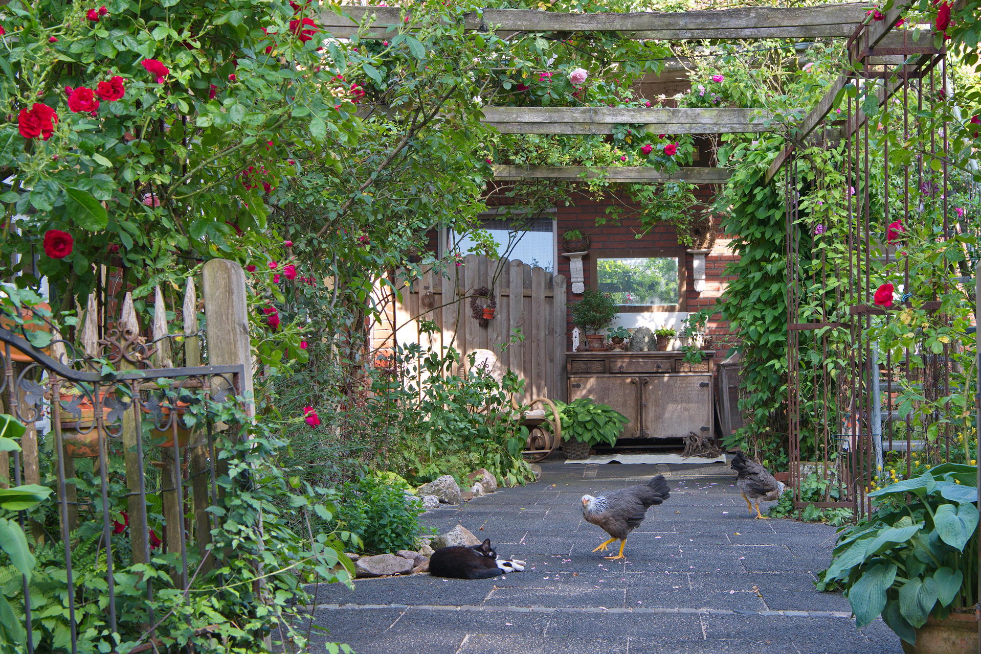 - Eingang, Kletterrose, Tor, Zaun, Katze