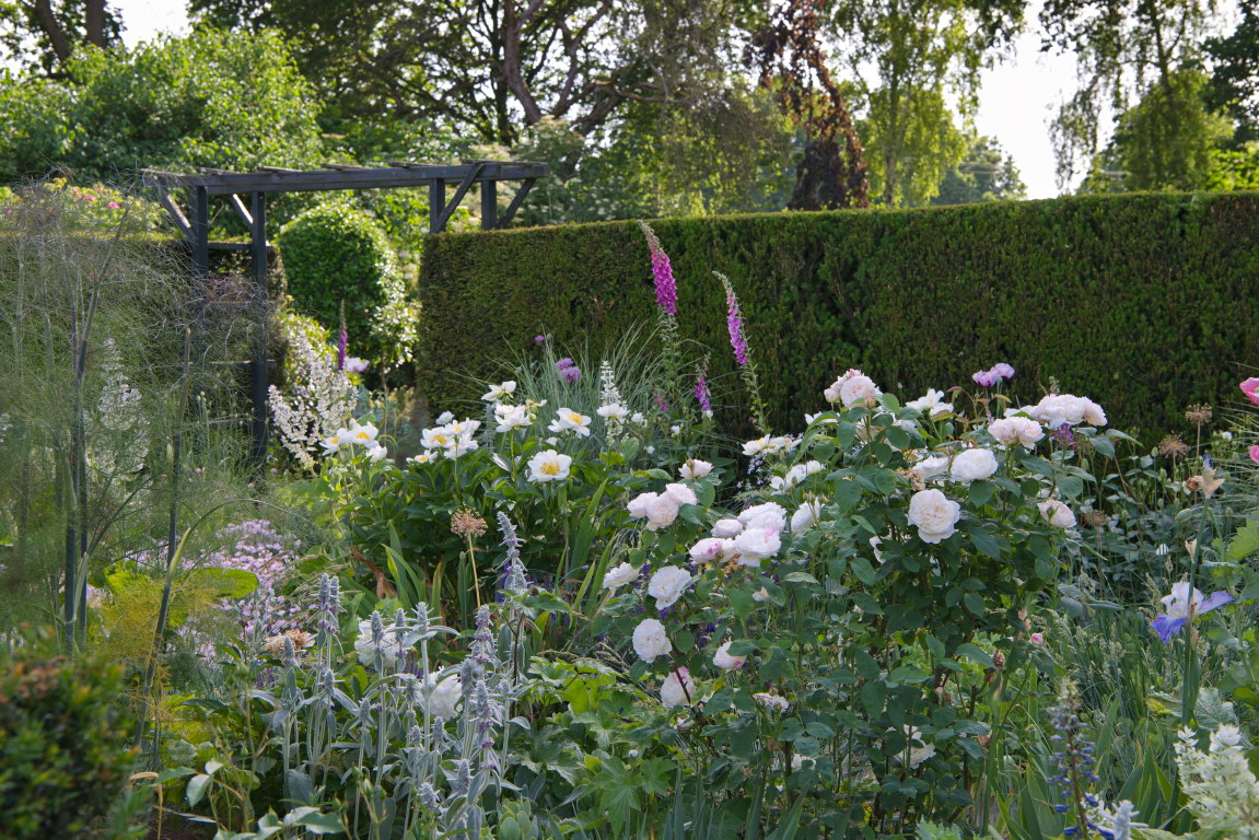 - Rose 'Winchester Cathedral', Salvia sclarea, Paeonia lactiflora 'Jan van Leeuwen'