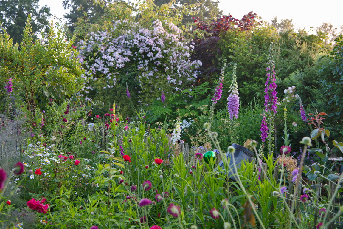 - Digitalis purpurea, Knautia macedonica, Rose 'Paul's Himalayan Musk', Papaver rhoeas