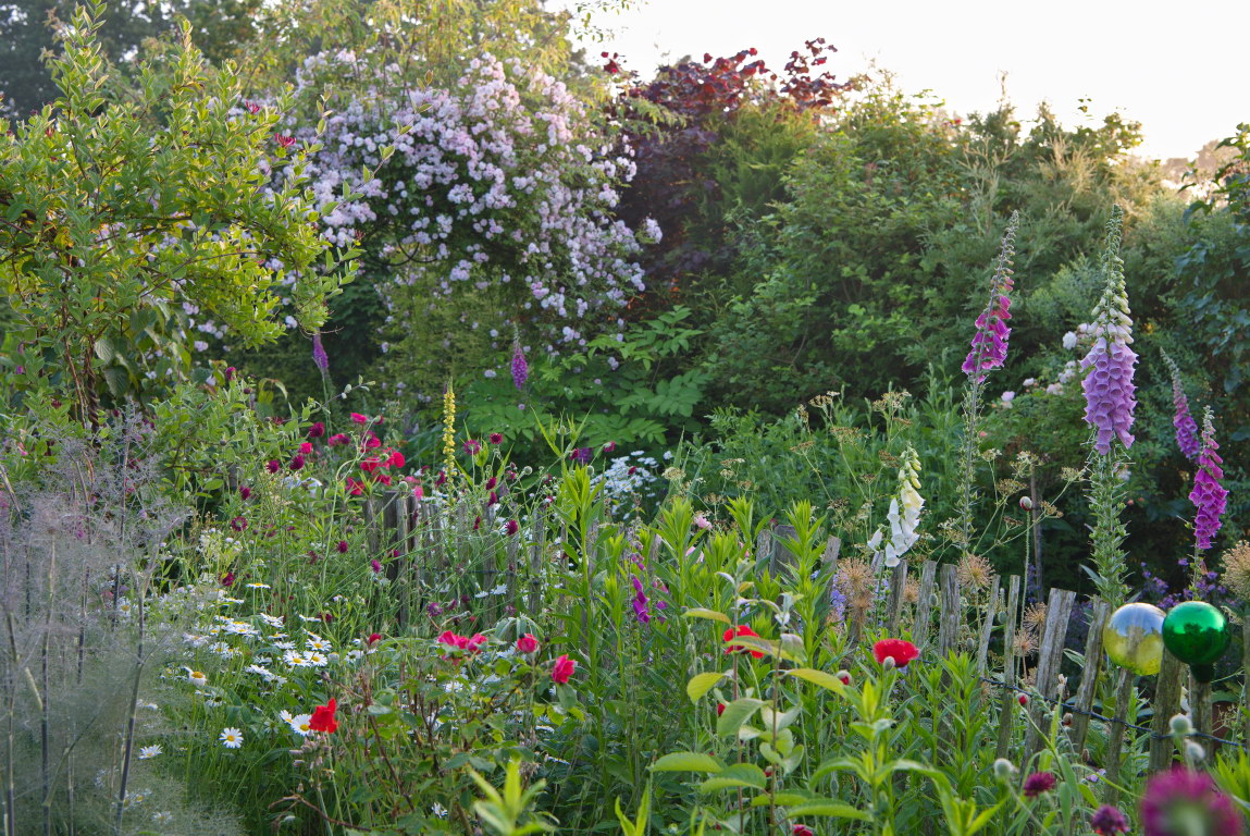 - Digitalis purpurea, Knautia macedonica, Leucanthemum maximum, Margerite, Rose 'Paul's Himalayan Musk'