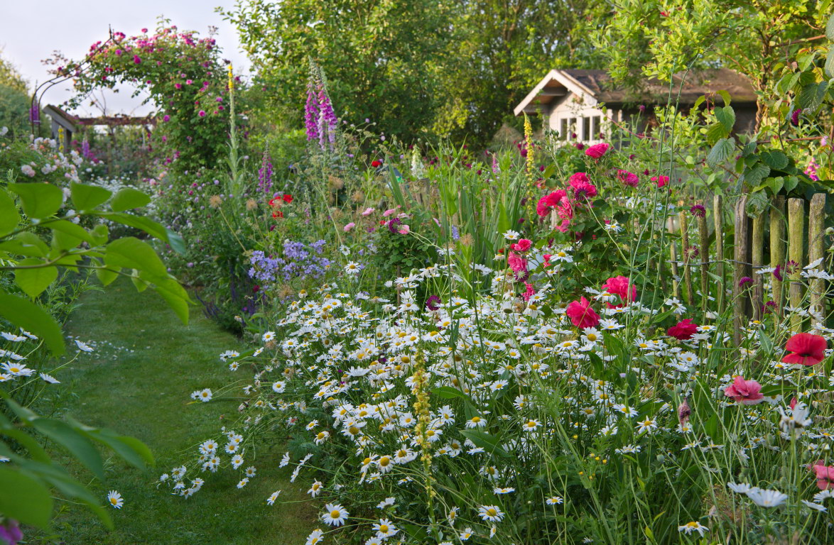 - Digitalis purpurea, Knautia macedonica, Leucanthemum maximum, Margerite, Rose 'Rosarium Uetersen', Verbascum, Papaver rhoeas