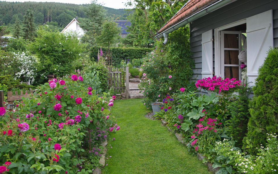 - Gartenhaus, Hecke, Petunien, Rose 'Aimable Rouge', Rose 'Grootendorst', Rose 'Königin von Denmark', Rose 'Pergolèse'