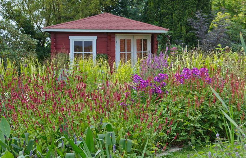 - Bistorta amplexicaulis, Calamagrostis x acutiflora 'Karl Foerster', Hechtkraut, Lythrum salicaria, Pfeilkraut, Polygonum amplexicaule, Pontederia cordata, Sagittaria, Sitzplatz, Steg, Teich, Adirondack Chair