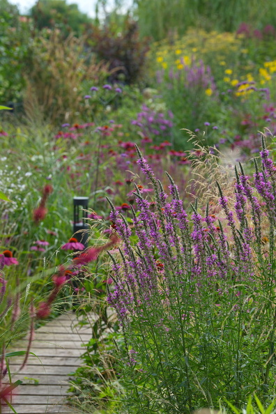 - Adirondack Chair, Eupatorium, Hechtkraut, Lythrum salicaria, Polygonum amplexicaule, Pontederia cordata, Sitzplatz, Steg, Teich