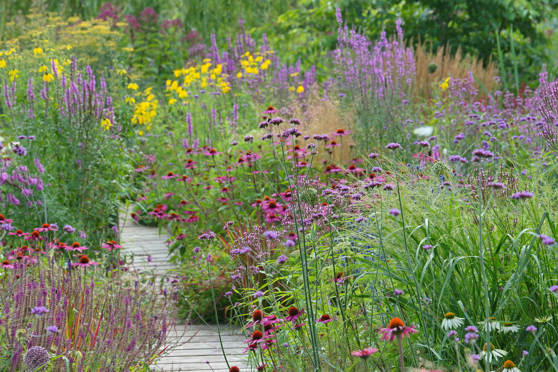 - Deschampsia caespitosa, Echinacea purpurea 'Alba', Echinacea purpurea 'Magnus', Eupatorium, Lythrum salicaria, Präriesonnenhut, Ratibida pinnata, Steg, Verbena bonariensis, Verbena hastata