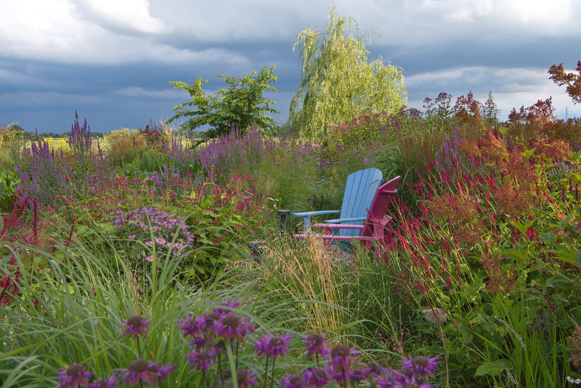 - Bistorta amplexicaulis, Calamagrostis x acutiflora 'Karl Foerster', Deschampsia caespitosa, Eupatorium, Filipendula, Monarda 'Häuptling', Monarda fistulosa var. menthifolia 'Mohikaner', Polygonum amplexicaule, Sitzplatz, Adirondack Chair