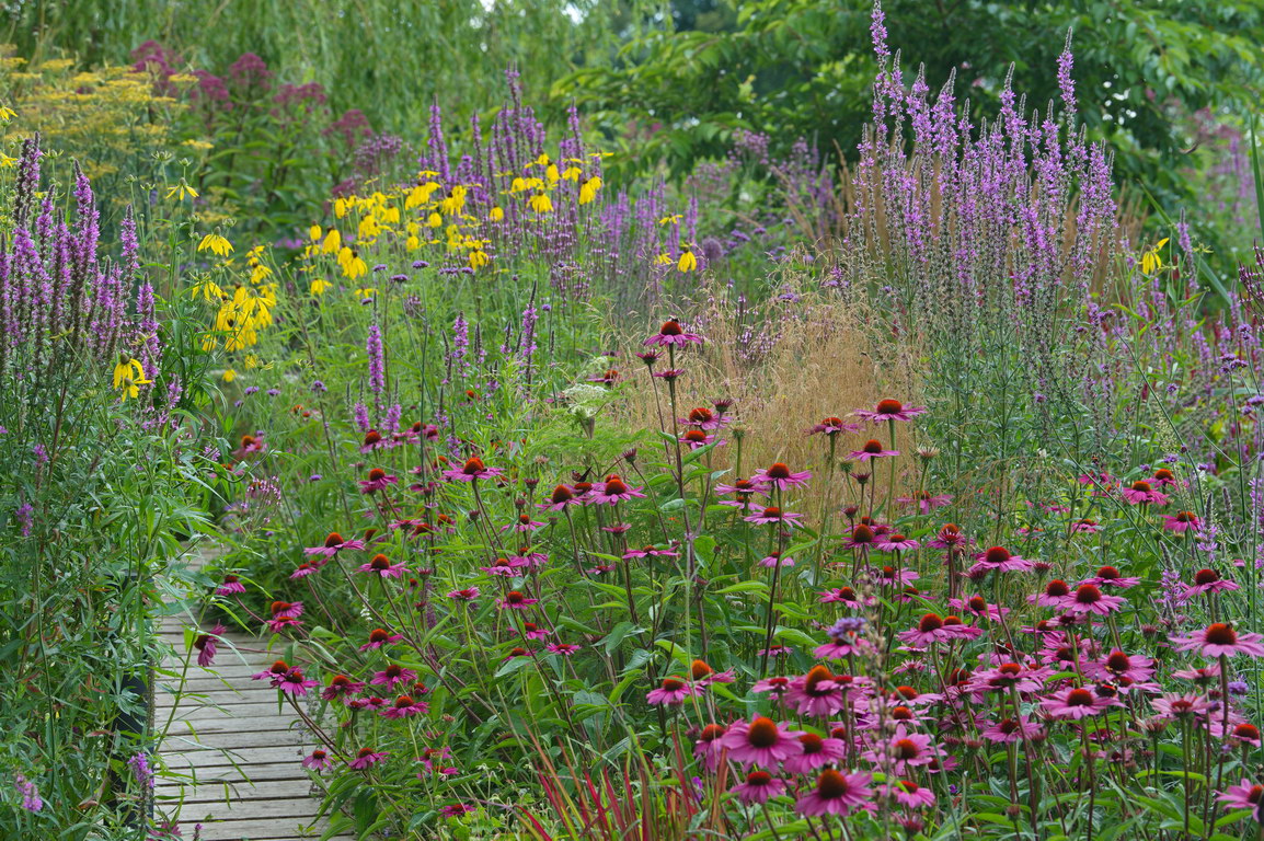 - Deschampsia caespitosa, Echinacea purpurea 'Magnus', Eupatorium, Lythrum salicaria, Präriesonnenhut, Ratibida pinnata, Weg
