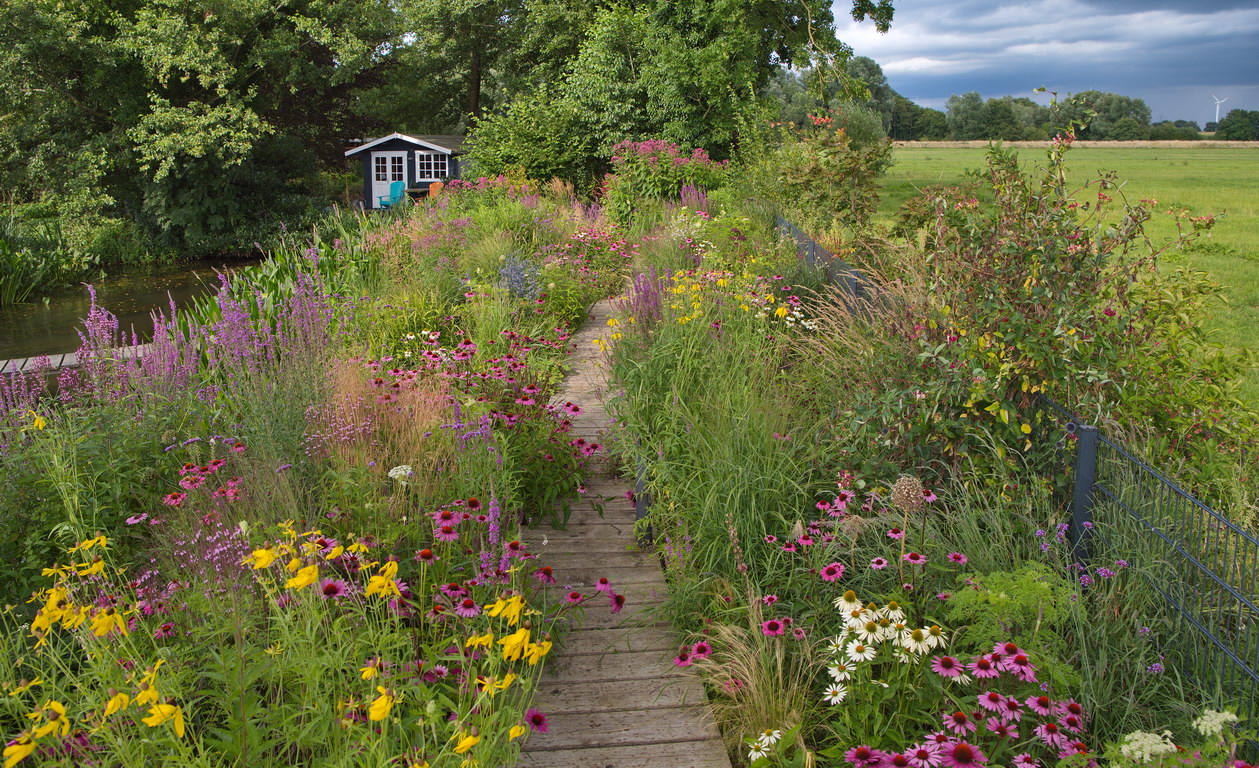 - Deschampsia caespitosa, Echinacea purpurea 'Alba', Echinacea purpurea 'Magnus', Eryngium planum 'Blaukappe', Eupatorium, Lythrum, Präriesonnenhut, Ratibida pinnata, Weg