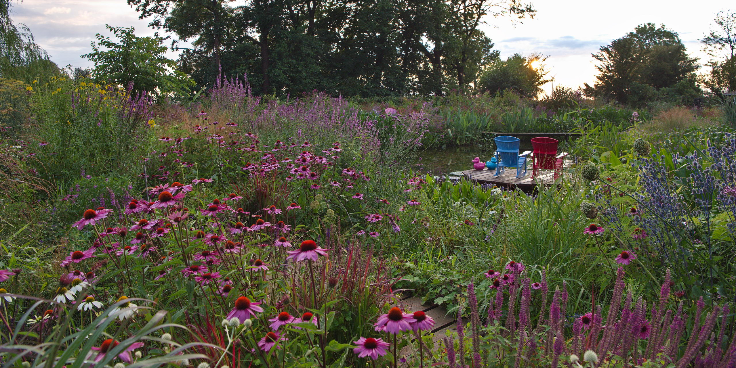 - Adirondack Chair, Deschampsia caespitosa, Echinacea purpurea 'Magnus', Eryngium planum 'Blaukappe', Eupatorium, Hechtkraut, Lythrum, Pontederia cordata, Sitzplatz, Steg, Teich, Verbena bonariensis, Panorama