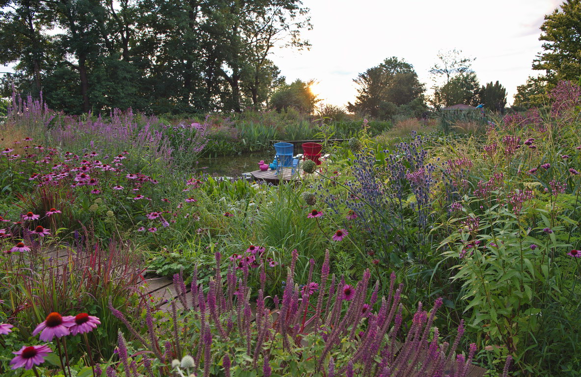 - Adirondack Chair, Calamagrostis x acutiflora 'Karl Foerster', Deschampsia caespitosa, Echinacea purpurea 'Magnus', Eryngium planum 'Blaukappe', Hechtkraut, Lythrum, Pontederia cordata, Sitzplatz, Steg, Teich, Verbena bonariensis, Verbena hastata