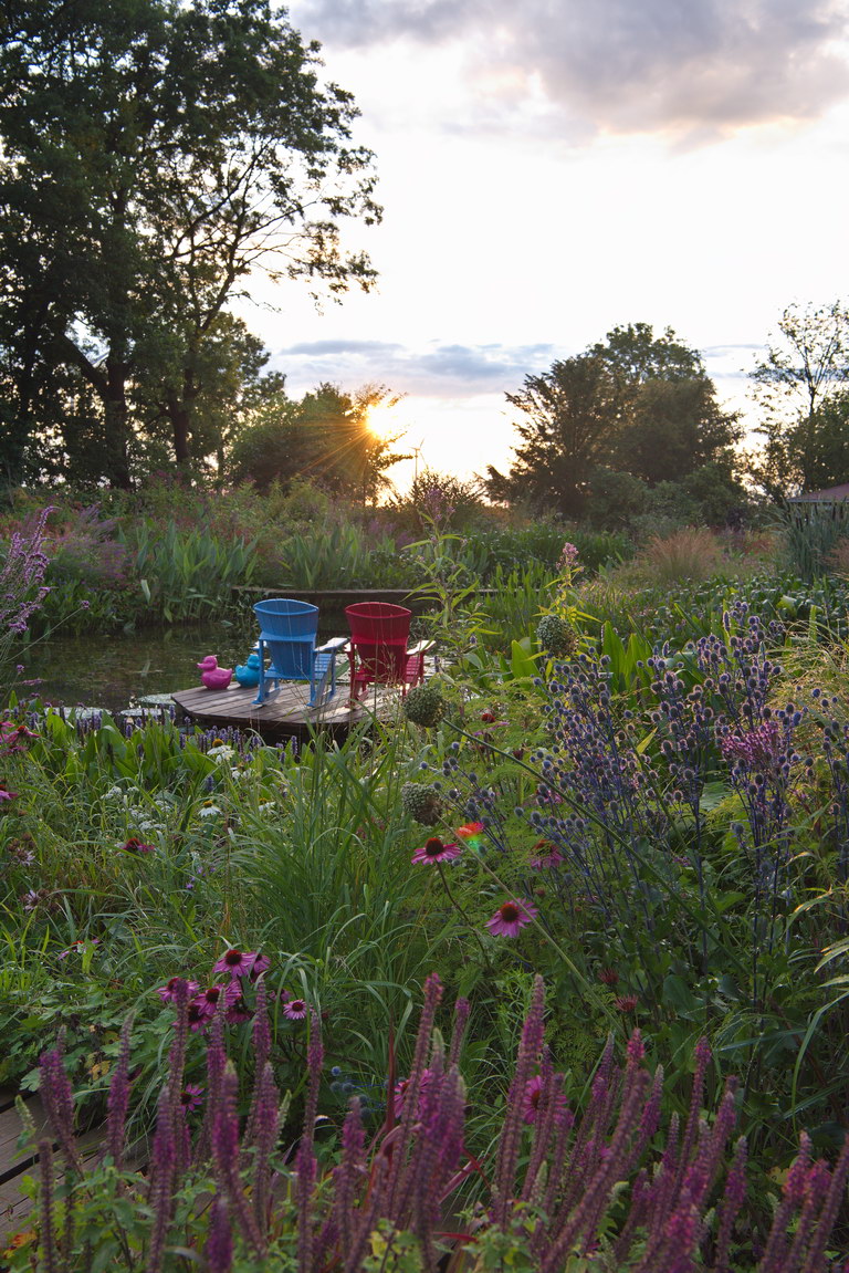 - Echinacea purpurea 'Magnus', Eryngium planum 'Blaukappe', Hechtkraut, Lythrum, Pontederia cordata, Sitzplatz, Steg, Teich, Verbena bonariensis, Adirondack Chair