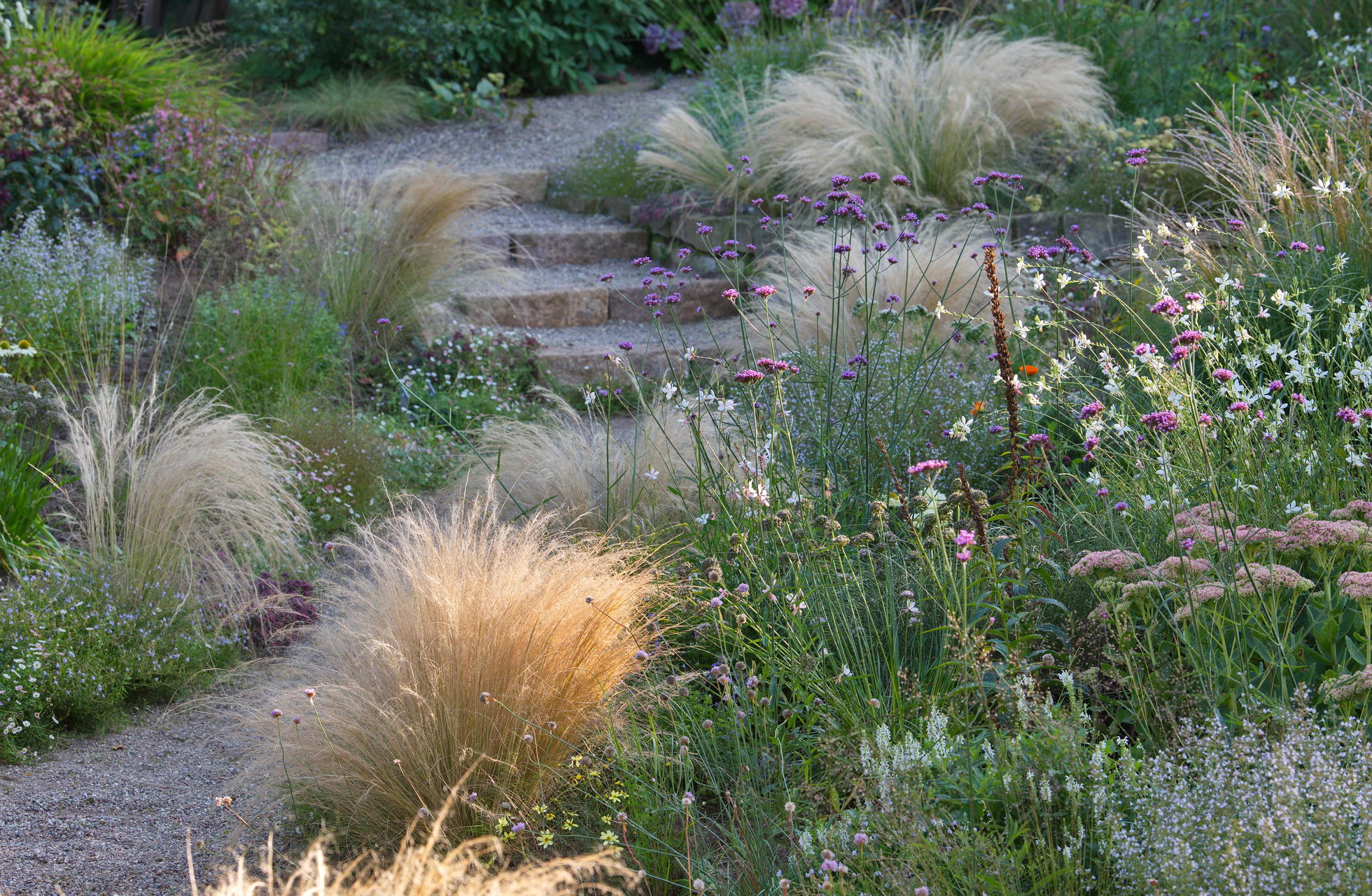 - Calamintha nepeta 'Triumphator', Gaura lindheimeri, Stipa tenuissima, Stufen, Verbena bonariensis, Kiesweg