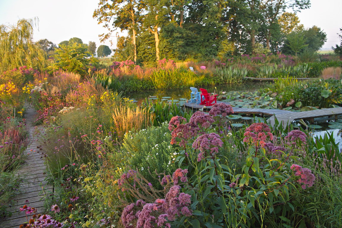 - Adirondack Chair, Astern, Calamagrostis, Eupatorium, Hechtkraut, Pontederia cordata, Ratibida pinnata, Steg, Teich, Thalia dealbata