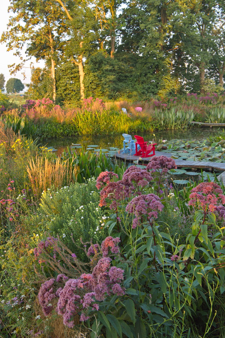 - Astern, Calamagrostis, Eupatorium, Hechtkraut, Pontederia cordata, Ratibida pinnata, Steg, Teich, Thalia dealbata, Adirondack Chair