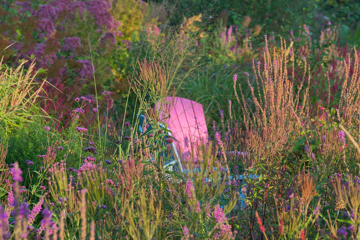 - Adirondack Chair, Eupatorium, Gräser, Lythrum, Sitzplatz, Verbena bonariensis