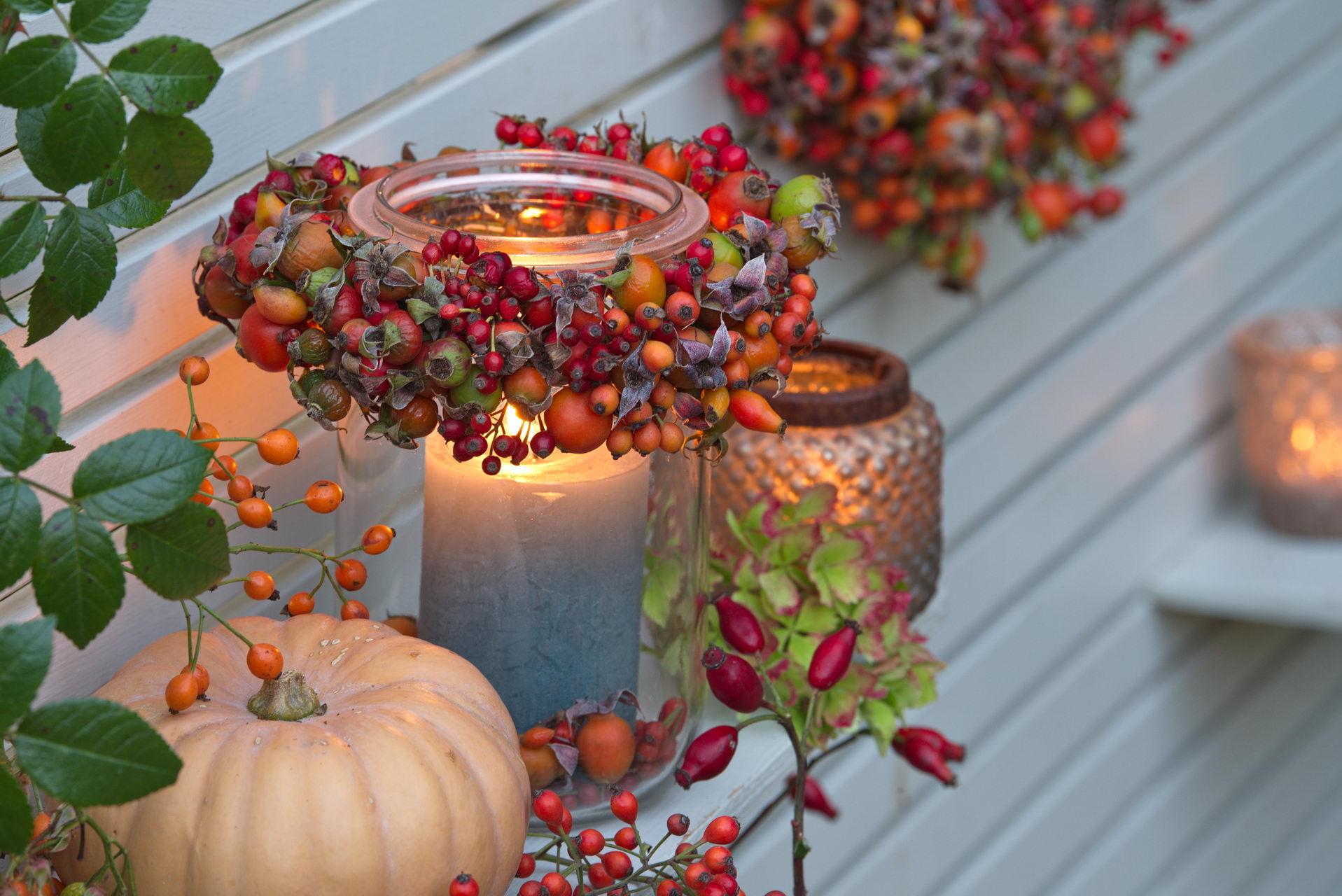 - DIY, Hagebutten, Kranz, Kürbis, Windlicht