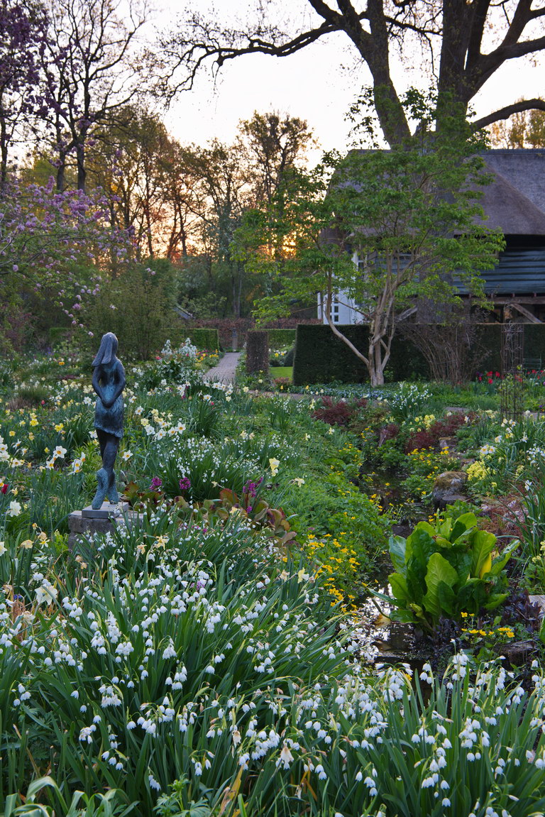 - Bach, Bergenia, Caltha palustris, Leucojum aestivum, Lysichiton americanus, Narzissen, Primula veris, Skulprtur, Sumpfdotterblume