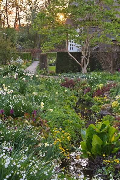 - Apfelbaum, Bach, Bergenia, Caltha palustris, Leucojum aestivum, Malus, Narzissen, Primula veris, Sumpfdotterblume, Weg