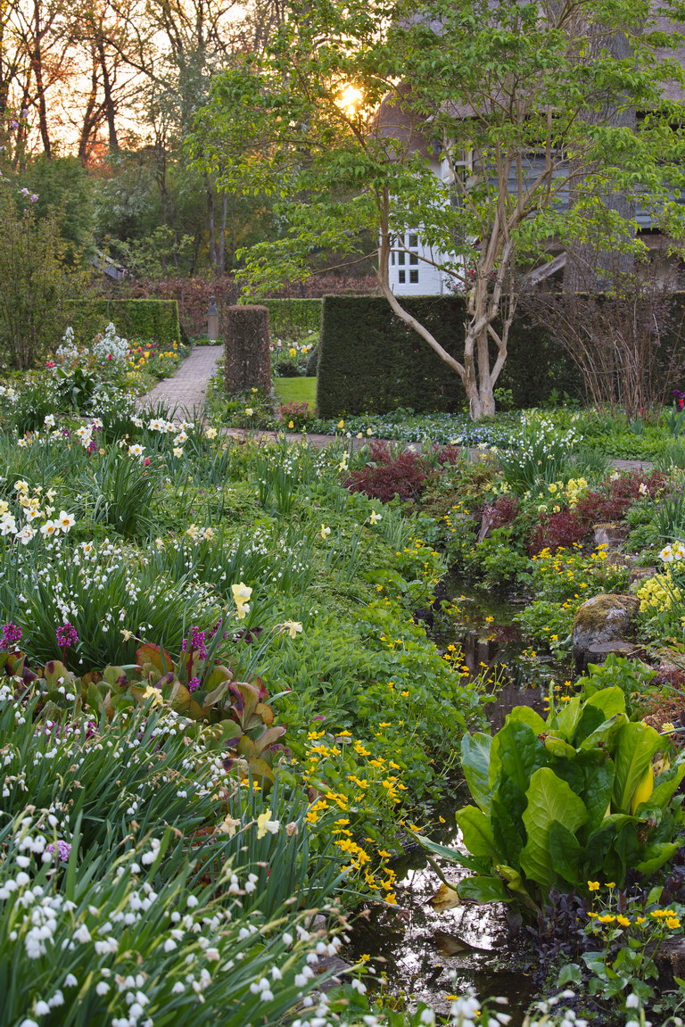 - Bach, Bergenia, Caltha palustris, Heptacodium miconioides, Leucojum aestivum, Lysichiton americanus, Narzissen, Primula veris, Sumpfdotterblume