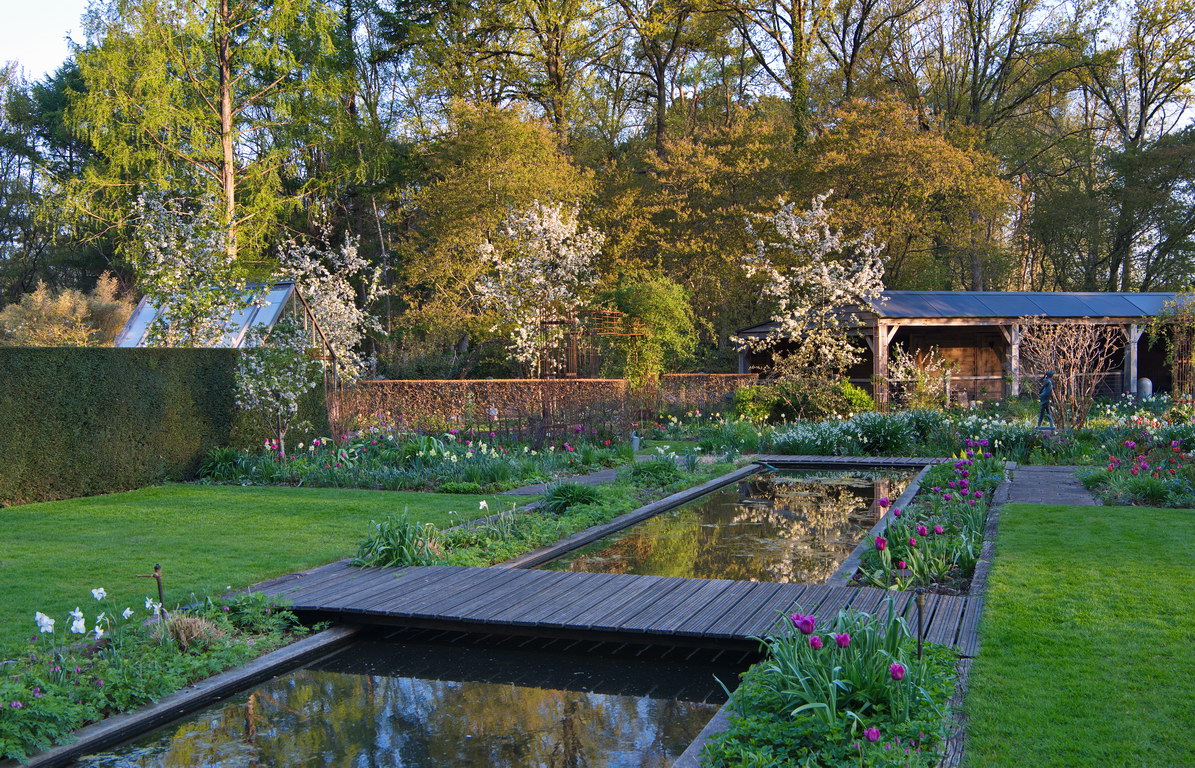 - Leucojum aestivum, Narzissen, Steg, Wasserbecken, Malus