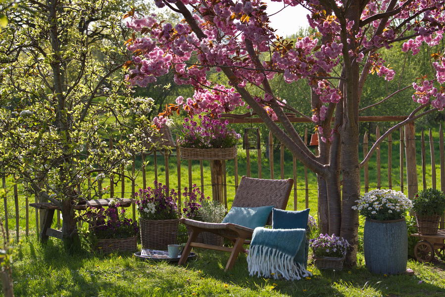 - Prunus serrula 'Kanzan', Sitzplatz, Töpfe, Zierkirsche, Birne
