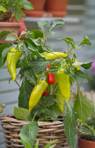 - Balkon, Erdbeere, Jungpflanzen, Rosmarin, Sichtschutz, Tagetes, Terrasse, Thymus, Tomate, Topf