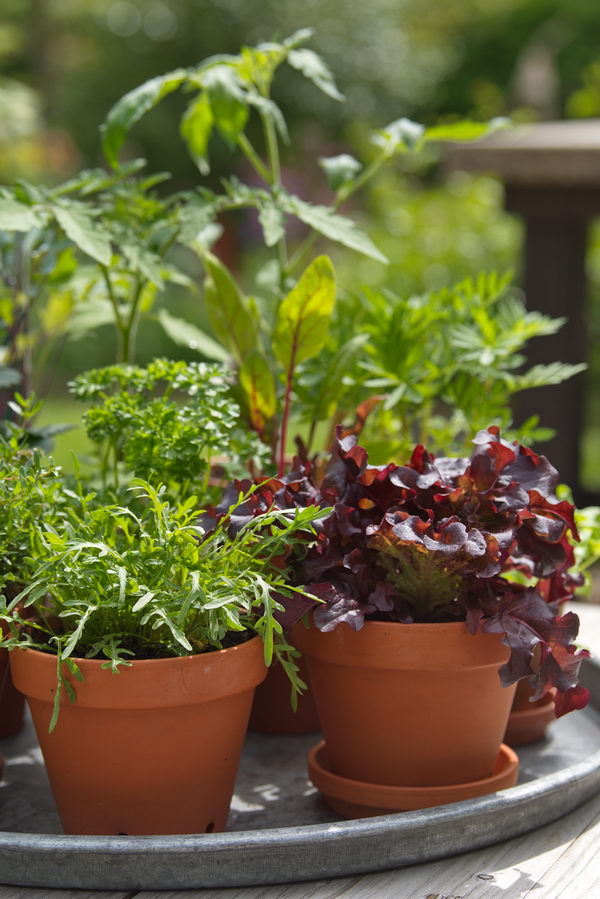 - Bohnenkraut, Petersilie, Rauke, Salat, Tagetes, Tomate, Töpfe