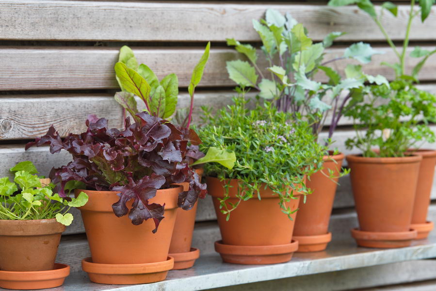 - Bohnenkraut, Jungpflanzen, Kohlrabi, Mangold, Petersilie, Regal, Salat, Tomate, Töpfe