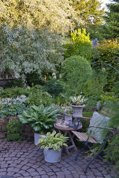 Funkien, Pflaster, Pyrus salicifolia, Sitzplatz, graulaubig, Dicentra formosa