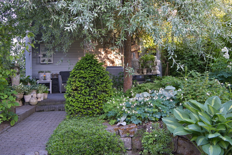 Hosta, Sitzplatz, weidenblättrige Birne, rund, Pflaster, Naturstein