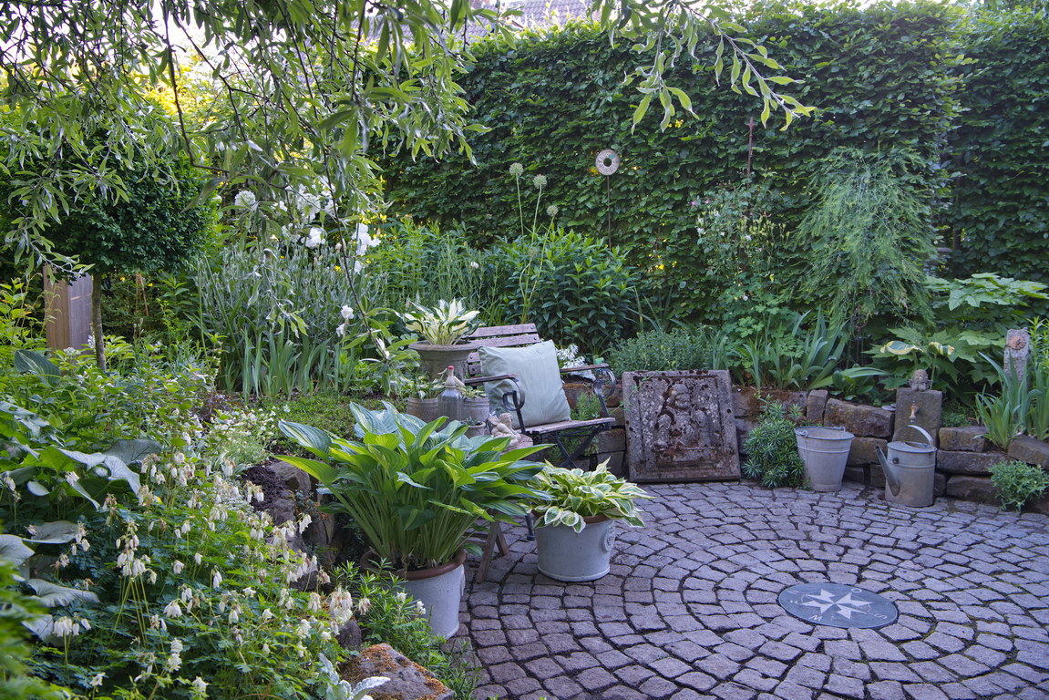 Hosta, Sitzplatz, weidenblättrige Birne, rund, Pflaster, Naturstein