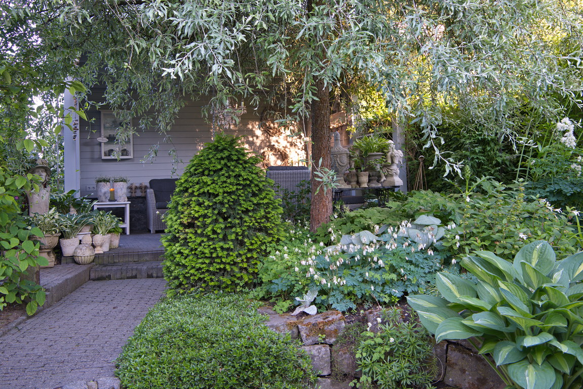 - Dicentra formosa, Pavillon, Pyrus salicifolia, Sitzplatz, Weg, weidenblättrige Birne, Taxus