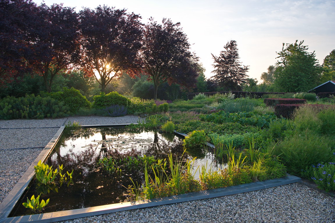 - Blutpflaume, Euphorbia characias ssp. wulfenii, Hedera, Phlomis russeliana, Prunus cerasifera 'Nigra', Wasserbecken