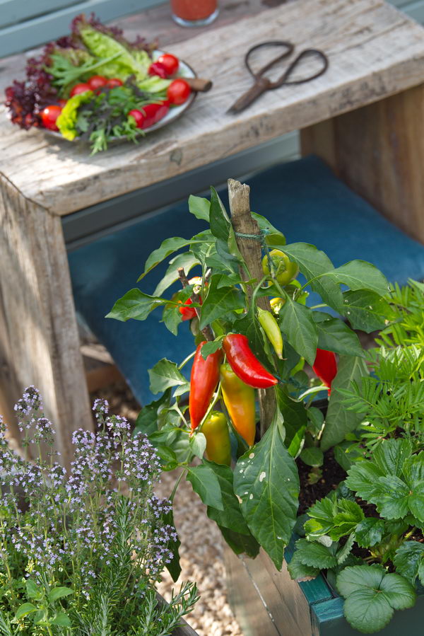 Gemüse, Kübel, Salat, Tomate, ernten, milde Chili, Kräuter, Erdbeere