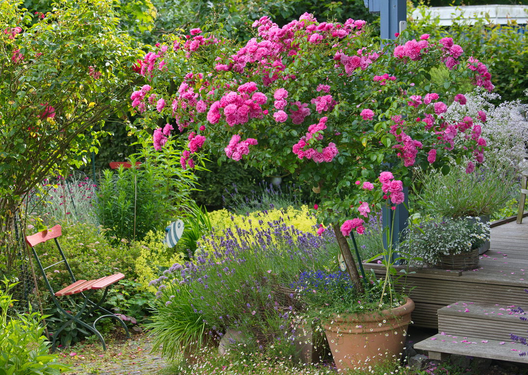 - Lavendel, Rose 'Leonardo da Vinci', Stämmchen, Topf, Alchemilla mollis