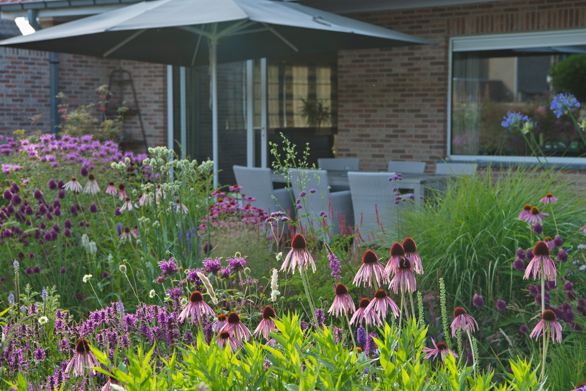 - Allium sphaerocephalon, Echinacea pallida, Eryngium yuccifolium, Monarda 'Violet Queen', Sitzplatz, Sonnenschirm, Stachys, Terrasse