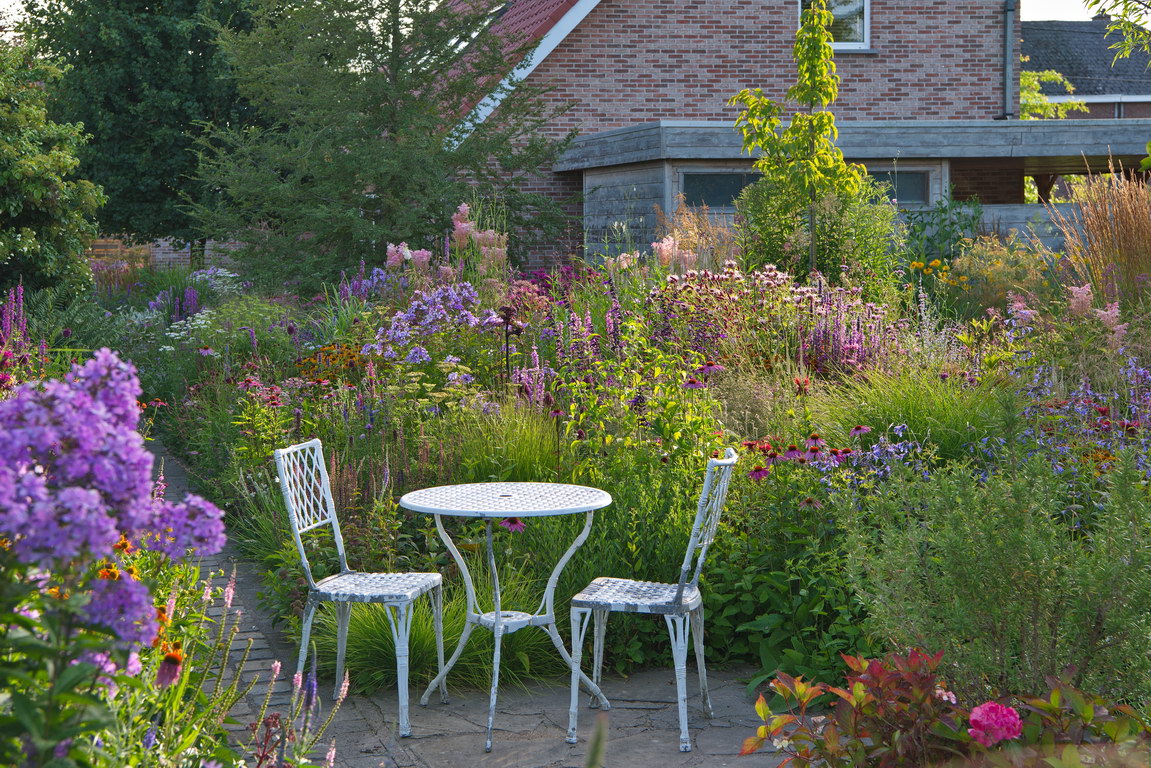 - Allium sphaerocephalon, Echinacea purpurea, Filipendula rubra 'Venusta', Helenium, Lythrum, Lythrum salicaria 'Robert', Monarda, Phlox paniculata 'Blue-Evening', Sanguisorba