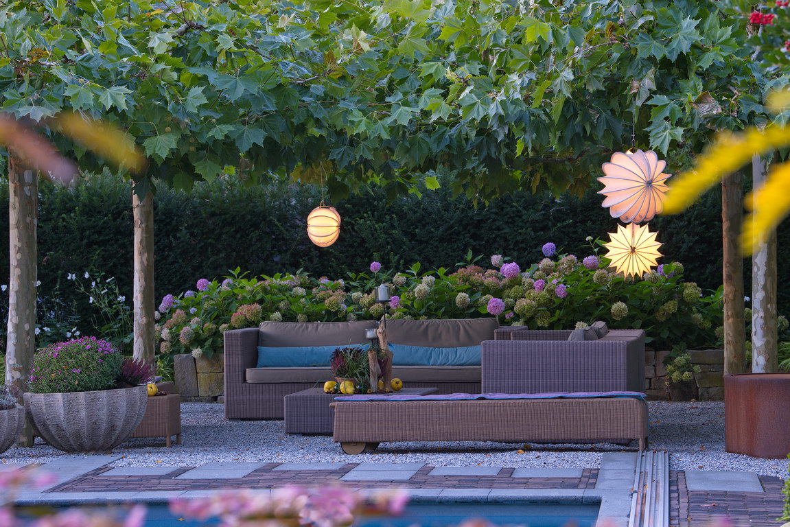 - Beleuchtung, Dachplatane, Dachspalier, Hydrangea, Lampion, Lounge, Platanus acerifolia, Sitzplatz, Pool