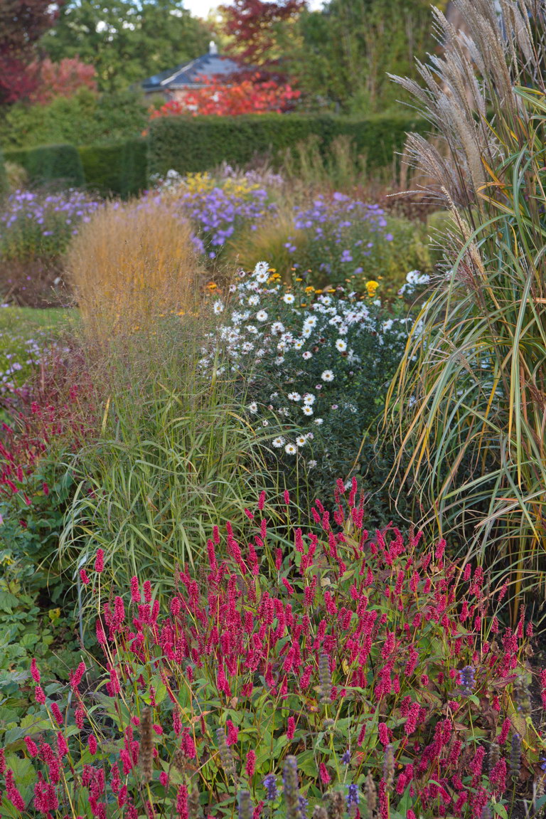 - Aster novi-belgii 'Schneekuppe', Bistorta amplexicaulis 'JS Delgado Macho ®', Chinaschilf, Miscanthus sinensis 'Prof. Richard Hansen', Panicum virgatum 'Buffalo Green'