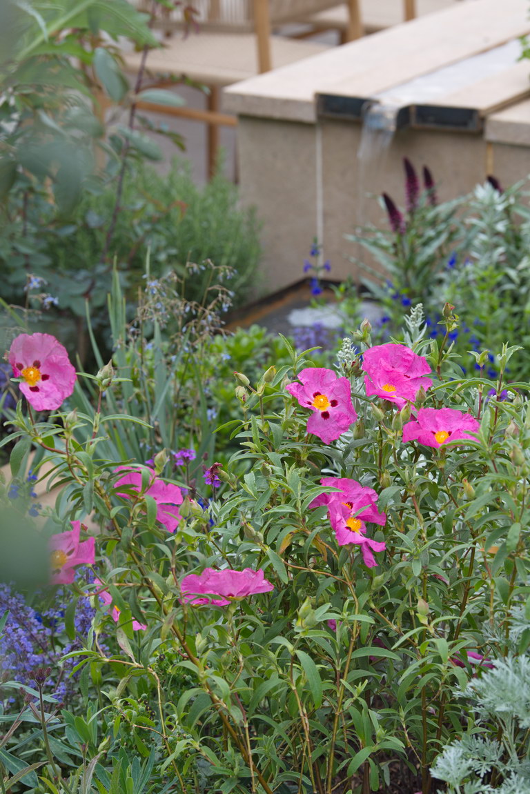 - Artemisia ludoviciana, Cistus, kleiner Garten, mediterran, Rinne, Wasser, Wasserauslauf, Wasserbecken