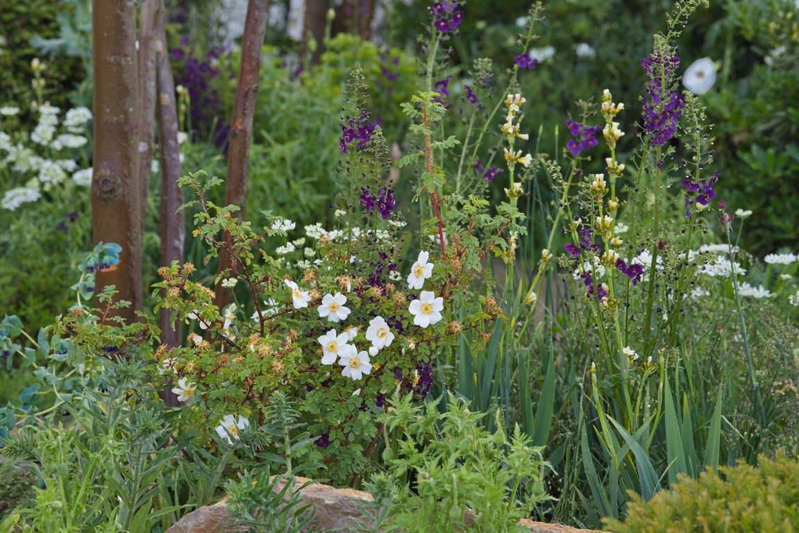 - Orlaya grandiflora, Rosa spinosissima, Sisyrinchium striatum, Verbascum phoeniceum 'Violetta'