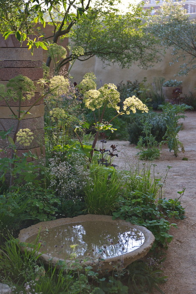 - Aeonium arboreum 'Zwartkop', Angelica archangelica, Elaeagnus umbellata, Klinker, Mauer, Pinus sylvestris, recycling, Sitzplatz, Terracotta, Wasserschale