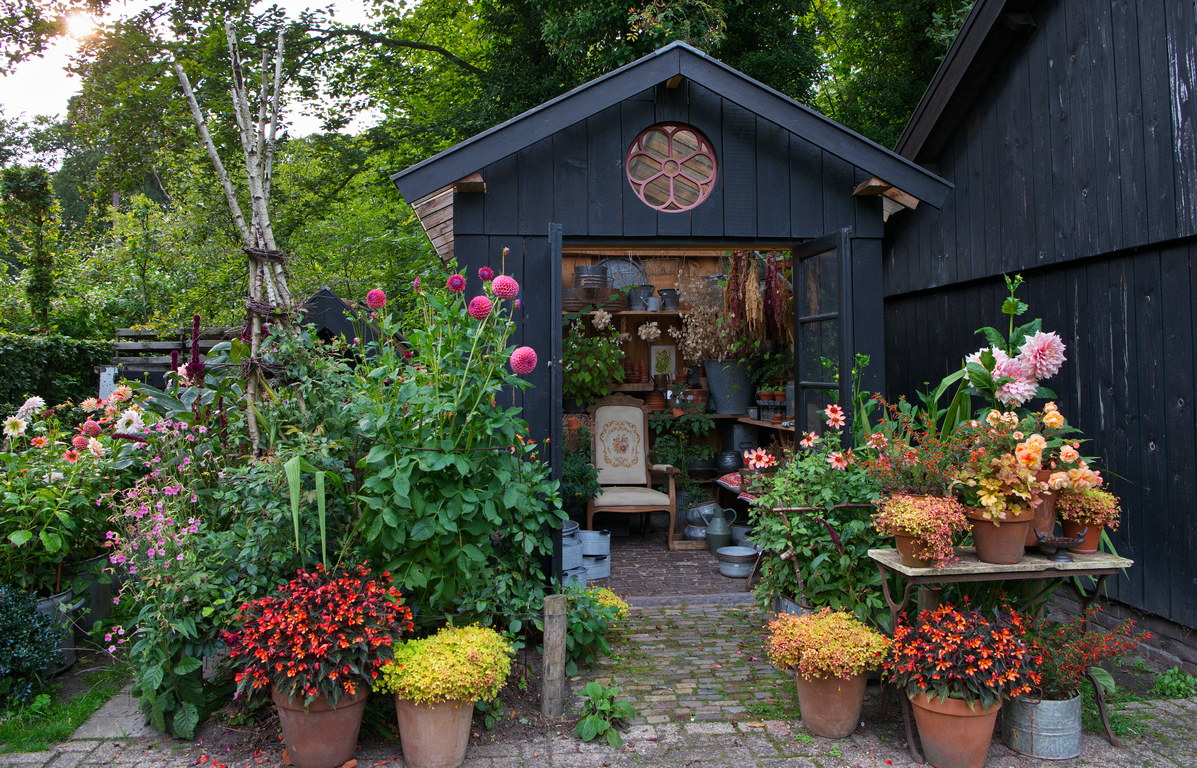 1-jährige, Gartenhaus, Töpfe, orange, Begonia, Dahlia