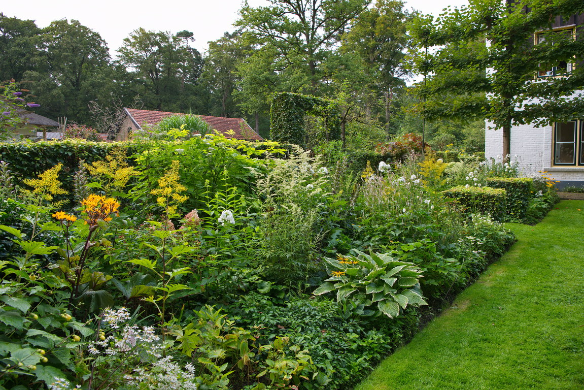 - Artemesia, Chinagreiskraut, Hosta, Ligulagia, Phlox, Rabatte, Sinacalia tangutica, Spalierlinde, gelb, weiß, Hecke