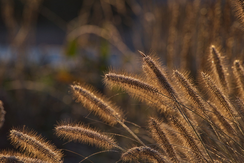 - Holzbohlen, Präriegarten, Raureif, Samenstände, Weg